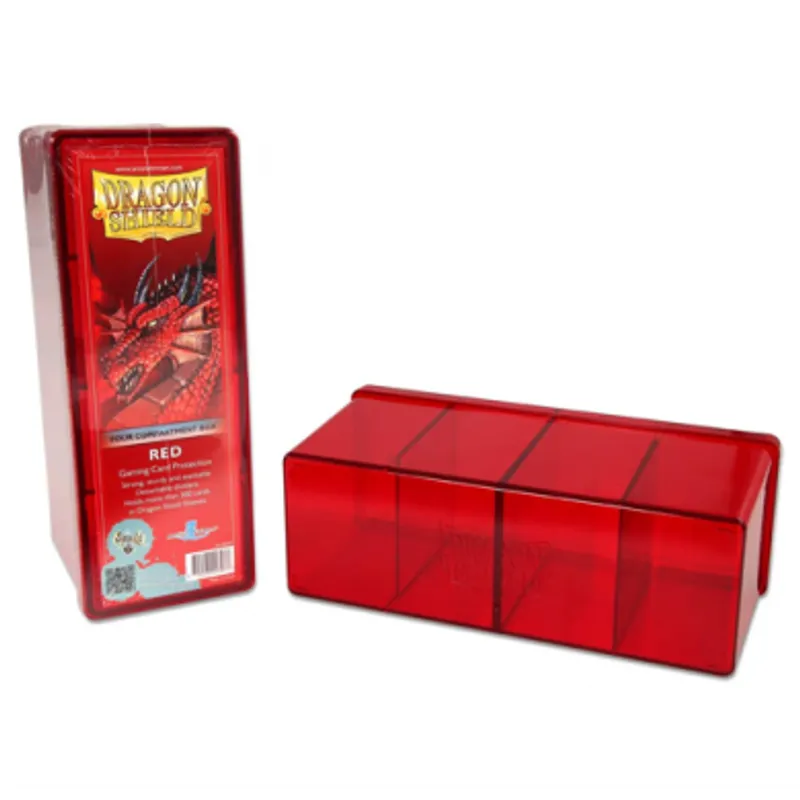Sa Dragon Shield crvenom kutijicom sa četiri zasebna odeljka možete sa sobom da ponesete i četiri svoja špila.. Odeljci su podeljeni tako da svaki odeljak pruža sigurnost za 80 karata u svojim slivovima. Kutijica je savršena za bilo koji TCG ili za bilo koju društvenu igru koja ima dosta karata. Dimenzije karata su standard (63×88 mm) ili japanske (small) (59×86 mm).