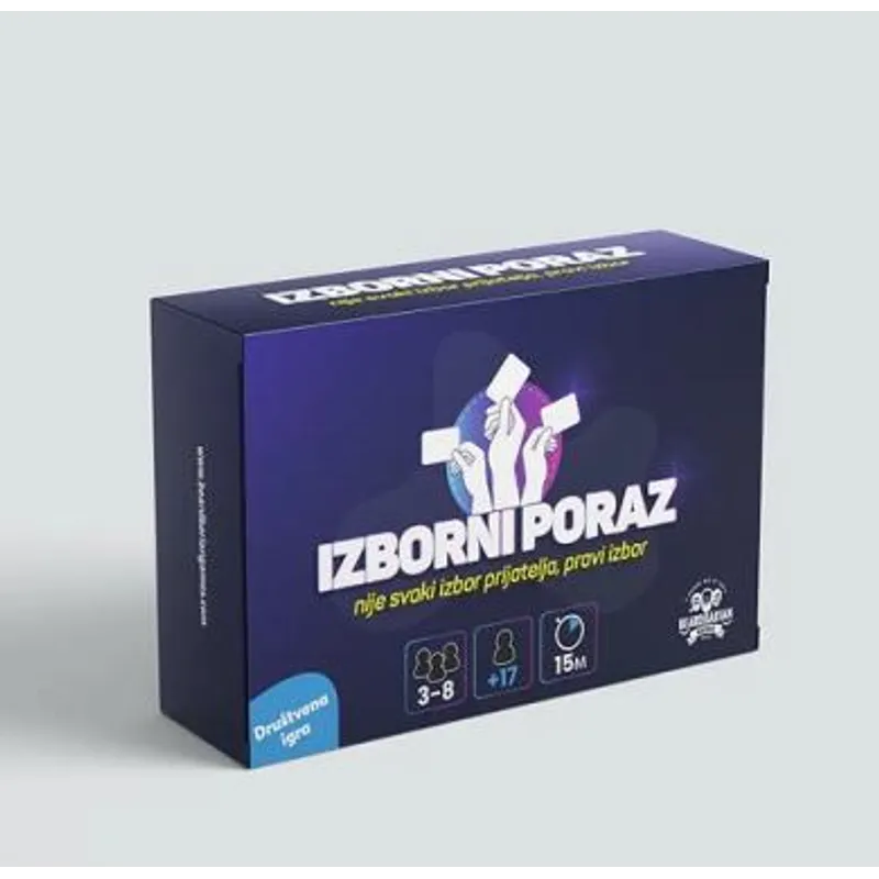 Društvena igra Izborni Poraz je zabavna igra koja će Vas i vaše prijatelje zabaviti, nasmejati ali i sigruno testirati Vaše prijateljstvo. U ovoj igri izvlačićete kartice sa pitanjima poptu toga ko je od igrača najveći instagram pozer, ili kome nikada ne biste dali krv. Nakon postavljanja kartice sa pitanjem svi igrači treba da glasaju za jednog ko najviše odgovara postavljenom pitanju, a igrač sa najviše glasova uzima karticu sa pitanjem kao poen. Na kraju igre pobednik, ako se tako može nazvati, je igrač sa najviše sakupljenih kartica. Da li ste spremni da saznate šta Vaši prijatelji zaista misle o Vama i testirate iskrenost među svojim drugarima?