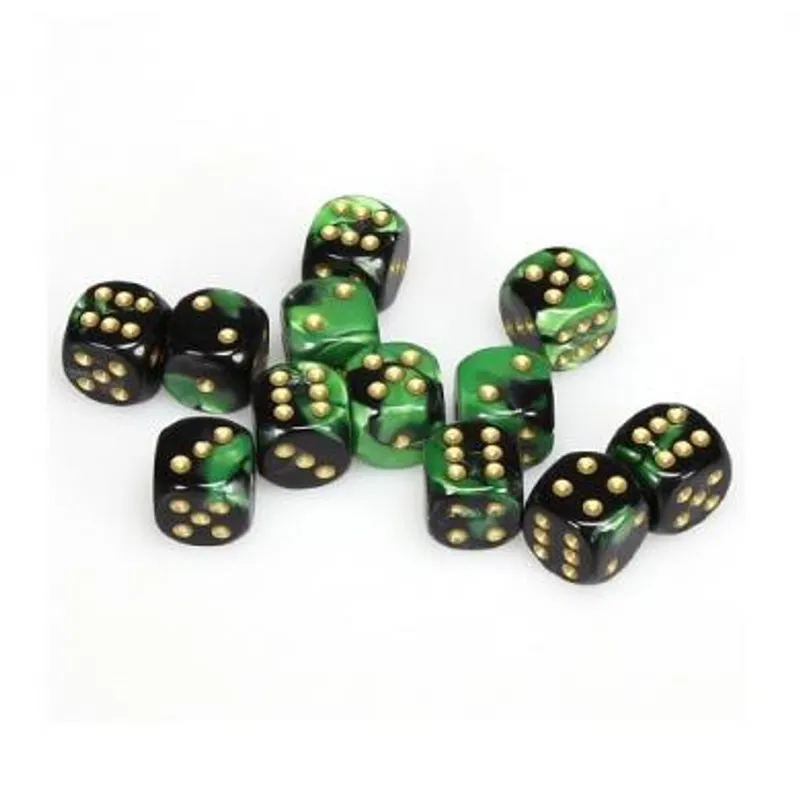 Chessex Gemini Black Green with Gold 16mm D6 (12 Dice)