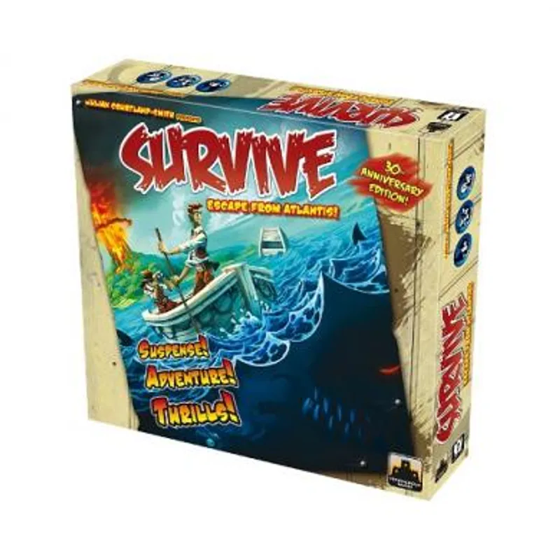 Društvena igra Survive Escape from Atlantis je okrutna igra u kojoj igrači nastoje da se evakuišu sa ostrva koje se raspada, dok to čine pokušavaju da spasu što više dragocentosti koje imaju, prisećajući se gde se one nalaze. Ostrvo sašinjeno od 40 pločica polako tone u okean, a svaki igrač kontroliše deset ljudi koji pokušavaju da se dokopaju bezbednih ostrva u okolini pre nego što glavno ostrvo potpuno potone. Igrači mogu ili plivati ili koristiti čamce za putovanje, ali moraju da budu oprezni jer na njihovom putu mogu naići na morske zmije, kitove ili ajkule pre nego što se spasu od potpune propasti! Da li imate ono što je potrebno da pobegnete i spasete se ove katastrofe?