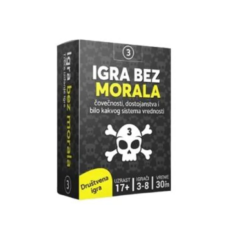 Društvena igra Igra Bez Morala 3.deo je bizarna i zabavna igra usmerena protiv čovečnosti, dostojanstva i bilo kakvog sistema vrednosti. Za razliku od ostalih igara sličnog tipa ova društvena igra je nastrana koliko Vi i Vaši prijatelji zajedno. Igra je priločno jednostavna, jedan igrač izvlači kartu na kojoj je pitanje a svi ostali igrači nude odgovor sa najzanimljivijom kartom koju imaju u ruci. Poen dobija onaj igrač čiji se ogovor najviše dopao igraču koji je postavio pitanje, a pobednik je onaj ko sakupi najviše poena. Da li je Vaš um dovoljno "čudan" da sakupite poene odgovarajući na sva škakljiva pitanja, ili u Vašem društvu postoje ljudi koji nemaju granice kada je u pitanju nastranost, saznajte igrajući ovu specifičnu igru!