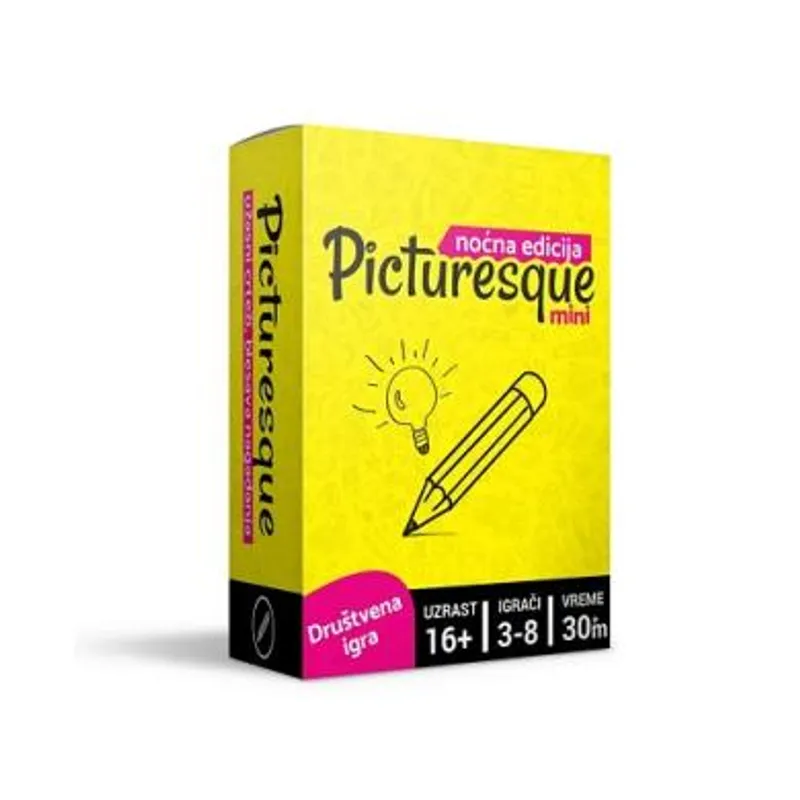 Društvena igra Picturesque Mini Noćna Edicija je društvena igra crtanja koja će Vama i Vašim prijateljima pružiti sate zabave i druženja. Inspiracija za ovu igru potekla je od društvene igre Picturesque, međutim ova verzija ne zahteva tablu i tajmer, a uz to donosi i mnoštvo novih pojmova koji je čine jedinstvenom. Picturesque Mini se može igrati u timovima ili da svako igra za sebe, a još jedna od novina kod ove igre je noćna strana na karticama koja sadri pojmove za odrasle! Cilj igre je jednostavan pokažite ostalima svoje veštine crtanja i sakupite najviše poena kako biste pobedli u ovoj igri. Da li ste spremni da nadmašite sve ostale i dokažete da ne postoji pojam koji ne možete da nacrtate bolje od svih?