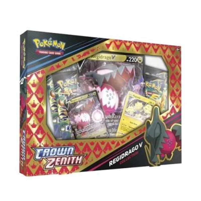 Pokemoni Vašeg protivnika neće imati gde da se sakriju, kada Regidrago V krene u borbu, sa svojim laserskim zrakom koji cilja čak do klupe sa Pokemon-ima. Ovaj legendarni Pokemon zmajskog tipa je spreman da se pridruži Vašem špilu u vidu svetlucave promotivne karte, zajedno sa munjevitim Regieleki-jem. Takođe, ova specijalna Pokemon TCG Crown Zenith Regidrago V Collection kutija sadrži i veliku promotivnu kartu koja će se savršeno uklopiti u kolekciju Vaših Pokemon-a!
