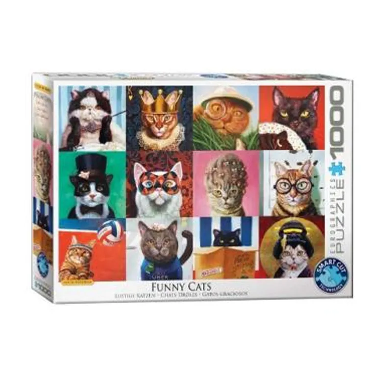 Puzzle Funny Cats by Lucia Heffernan je slagalica od 1000 koja će nasmejati sve one koji vole mačke, ali i ostale kućne ljubimce. Na slici su ove umiljate životinje šaljivo predstavljene kako nose krunu ili igraju odbojku. Ukoliko ste ljubitelj ovih krznenih ljubimaca i volite da se zabavljate i razvijate svoje veštine slažući puzle, ovo je prava slagalica za Vas!